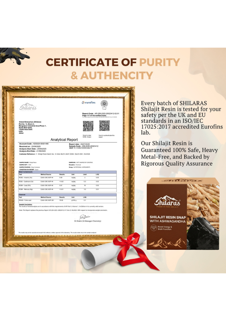 Yes, Shilaras is free from harmful heavy metals like Lead (Pb), Arsenic (As), Mercury (Hg) & Cadmium (Cd). We prioritize your health by using only 100% pure, contaminant-free Shilajit.